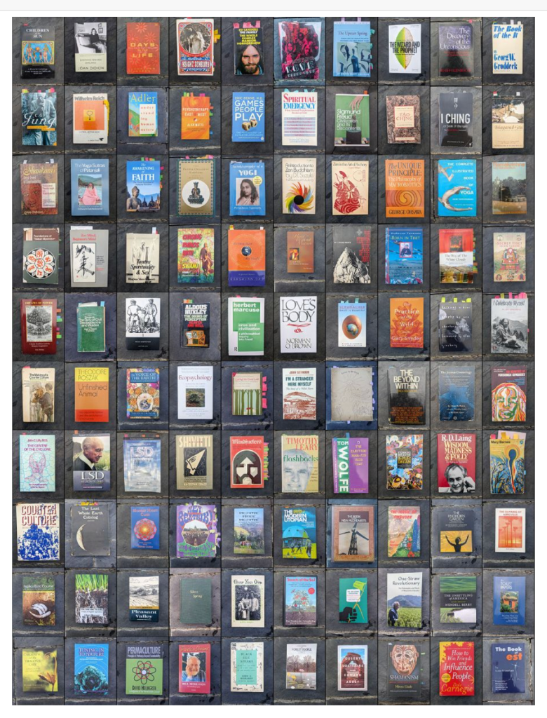 The books here are all ones which made a big impression on me, usually because the ideas they convey are luminous. I’ve broken the one hundred I’ve chosen into the following categories: History, Psychoanalysis, Eastern Philosophy, Tibet, Philosophy, Beat, Theodore Roszak, Self-sufficiency, Acid, Anti-Psychiatry, Communes, Agriculture, Permaculture, Anthropology, and Self-help.