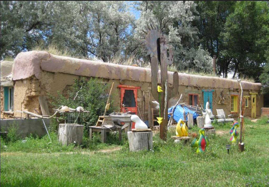 Adobe and sculpture at New Buffalo commune, Arroyo Hondo, New Mexico