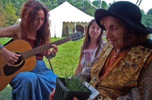 | Alicia serenades legendary herbalist Juliette de Bairacli-Levy at the New England Womens Herbal Conference, August, 2000. |