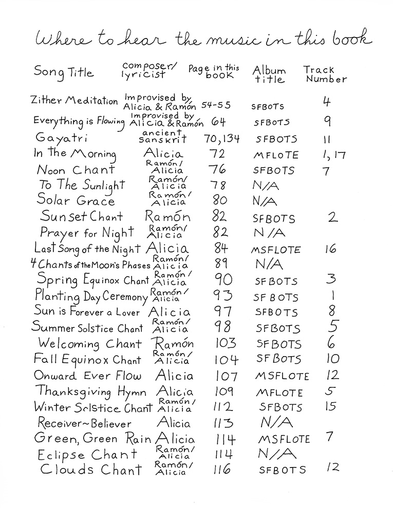 If you scroll down, you’ll find a chart I made for the new edition of Being of the Sun, showing the pages on which the songs, chants and improvisations appear, and the locations of existing recordings of them.