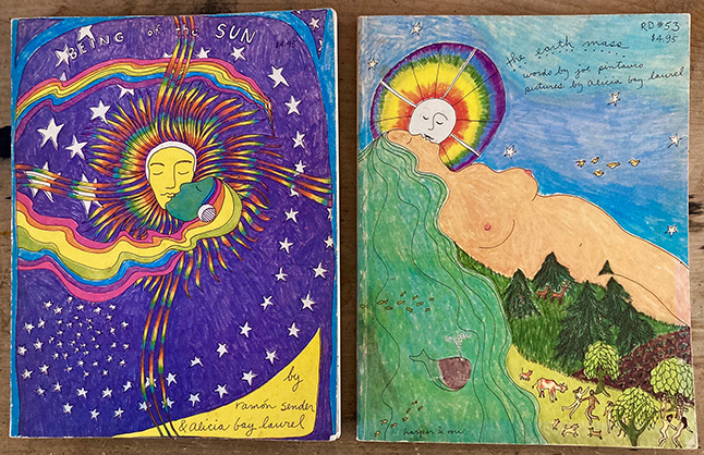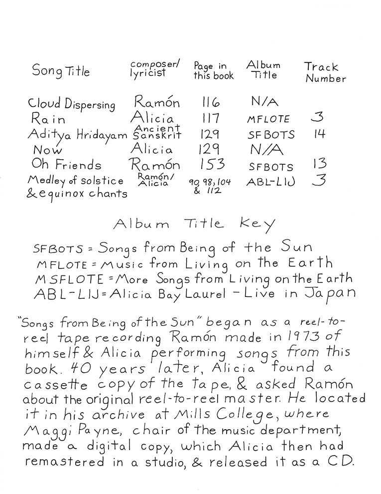 Twenty-seven years after its publication, I recorded three of the songs from Being of the Sun on my first CD, Music From Living on the Earth. In 2013, Ramón and I released Songs from Being of the Sun, a CD remastered from Ramón’s 1973 reel-to-reel tape of the two of us performing songs, chants and improvisations from our book, just before it was published. In 2015, I recorded three more of my songs first published in Being of the Sun on my seventh CD, More Songs From Living on the Earth, and, in 2018, on my eighth CD, Alicia Bay Laurel: Live In Japan, I perform a medley of the four chants for the solstices and equinoxes. I also performed this medley in the film I made in collaboration with filmmaker Luis Olano, of my live one-woman two-act storytelling and musical stage performance, Living on the Earth – The Musical.