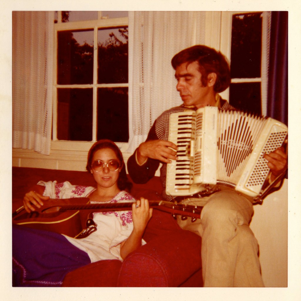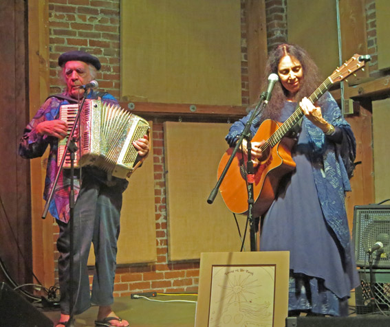 Ramón Sender Barayón and Alicia Bay Laurel perform together on November 13, 2016 at the Arlene Francis Center in Santa Rosa, California, as part of Alicia’s song and story show, Living on the Earth: The Musical. Alicia’s clothing is printed with the pages of her book.Alicia Bay Laurel and Ramón Sender Barayón making music together in 1973.