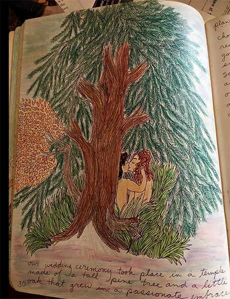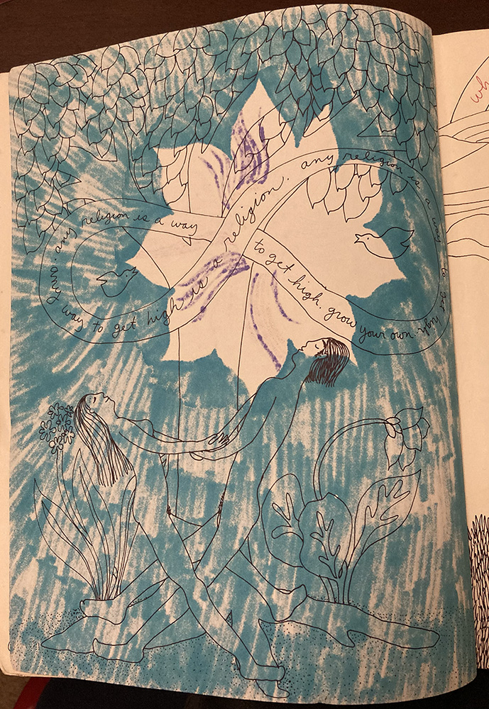 Page two. Behind the writing is an illustration from Living on the Earth of a girl awakening at dawn at her mountain encampment to the sound of a bird calling. She sits up nude in her sleeping bag, wherein her lover still snores. It’s got to be one of the most evocative drawings in the book.
