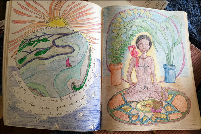 This is my coloring from one of Alicia Bay Laurel’s beautiful books, Being of the Sun. It’s not a coloring book. It’s about living life, but many illustrations give the opportunity to color. I had so much fun doing it, too. I colored much of the book. It was during my long convalesence from a crushed ankle. It was a godsend.