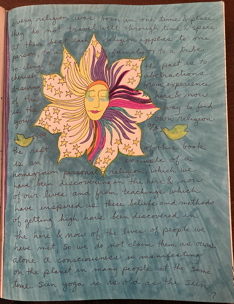 “A do-it-yourself spirituality and music book, Being of the Sun (Harper and Row, 1973), is the sequel to Alicia Bay Laurel’s classic, best-selling guide, Living on the Earth (Random House 1971 and 2000.) Co-written with author, avant-garde composer and solar yogi Ramón Sender Barayón, Being of the Sun provides a guide to creating one’s own religion, and also offers a compendium of spiritual practices the authors found valuable. Similar to Living On The Earth, Being of the Sun is entirely handwritten in Alicia’s flowing cursive script and illustrated on every page with her line drawings, a shining example of her immensely influential original book design. However, unlike the simple brown lines and cover of Alicia’s first book, Being of the Sun’s design features purple ink throughout, a colorful cover, plus eight full color illustrations within. Ramón created sheet music of the original spiritual songs and chants he and Alicia wrote for the book. Being of the Sun offers a window on hippie life in the early 70’s, and remains a cult classic among nature-worshippers to this day.” ____________________________________________________________________