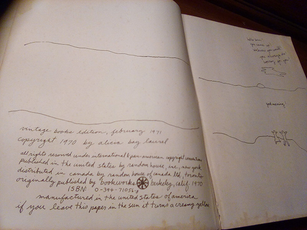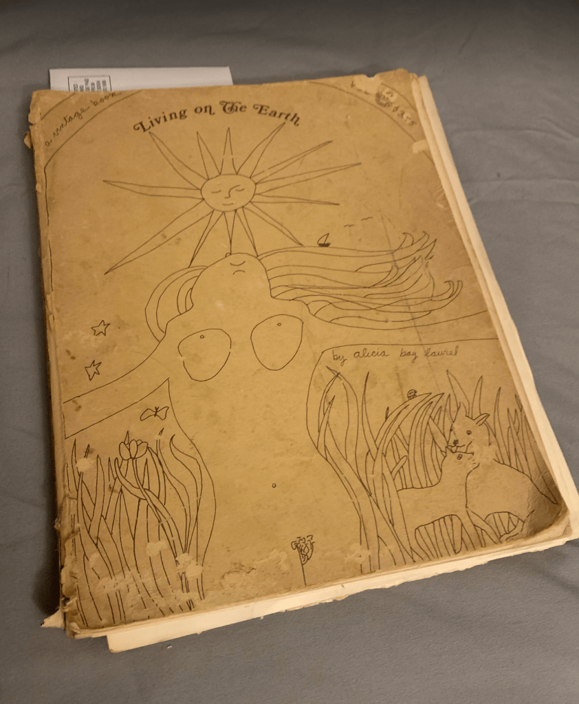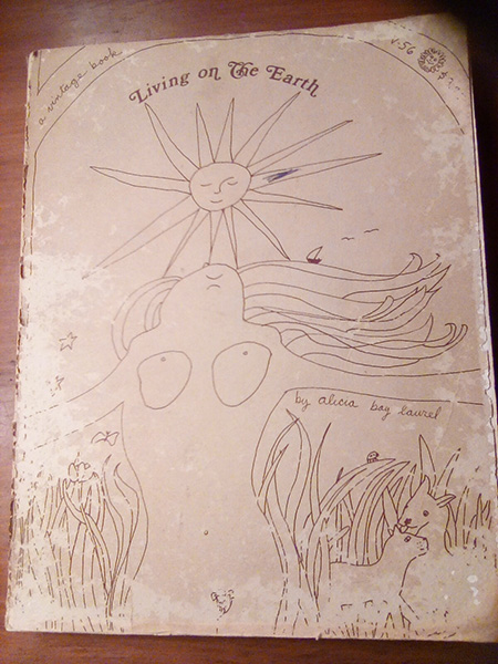 Many books are made of other men’s books, but only a handful grow directly from experience. Alicia Bay Laurel’s Living On The Earth is a rare example of the latter variety and, as such, provides a statement which is as richly poetic as it is pragmatic… Her poetic vision, in fact, cuts through the complexities of our daily lives in a manner so incisive as to be absolutely dismaying. With her childish scrawl and her delightfully carefree drawings, she has provided us not only with a prescription for healthy bodies, but, more than this, an elixir for regaining a purer society. Robert W. Conrow Michigan Daily March 24, 1971