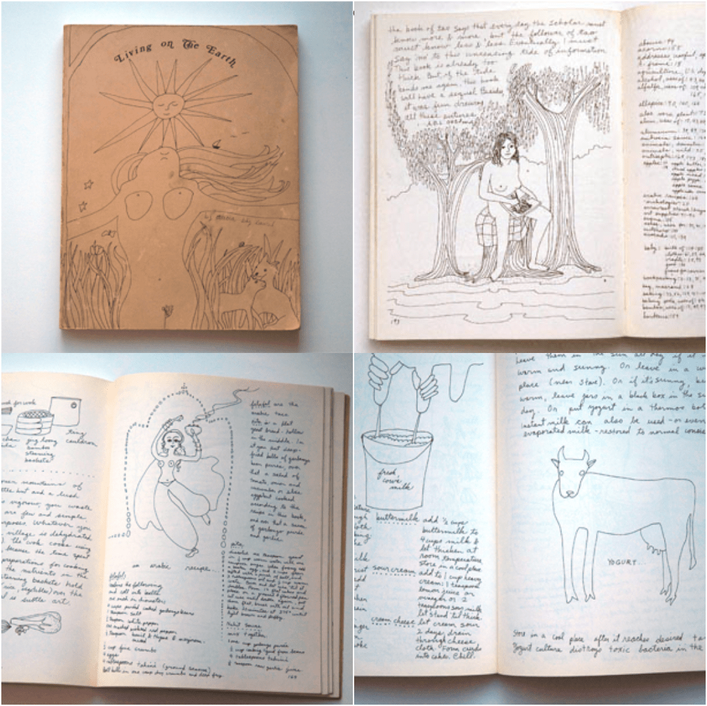 Another great source of Earthy information of the “Back to the Land Movement” of the day was Alicia Bay Laurel’s Living on the Earth. Written on Wheeler’s open land ranch, It was a delightfully illustrated and in-depth how-to-survive in the country manual “for people who would rather chop wood than work behind a desk.” The book was also a milestone marking the height of a Hippie way of living that was close to nature, with a focus on sustainable living and communal consciousness.