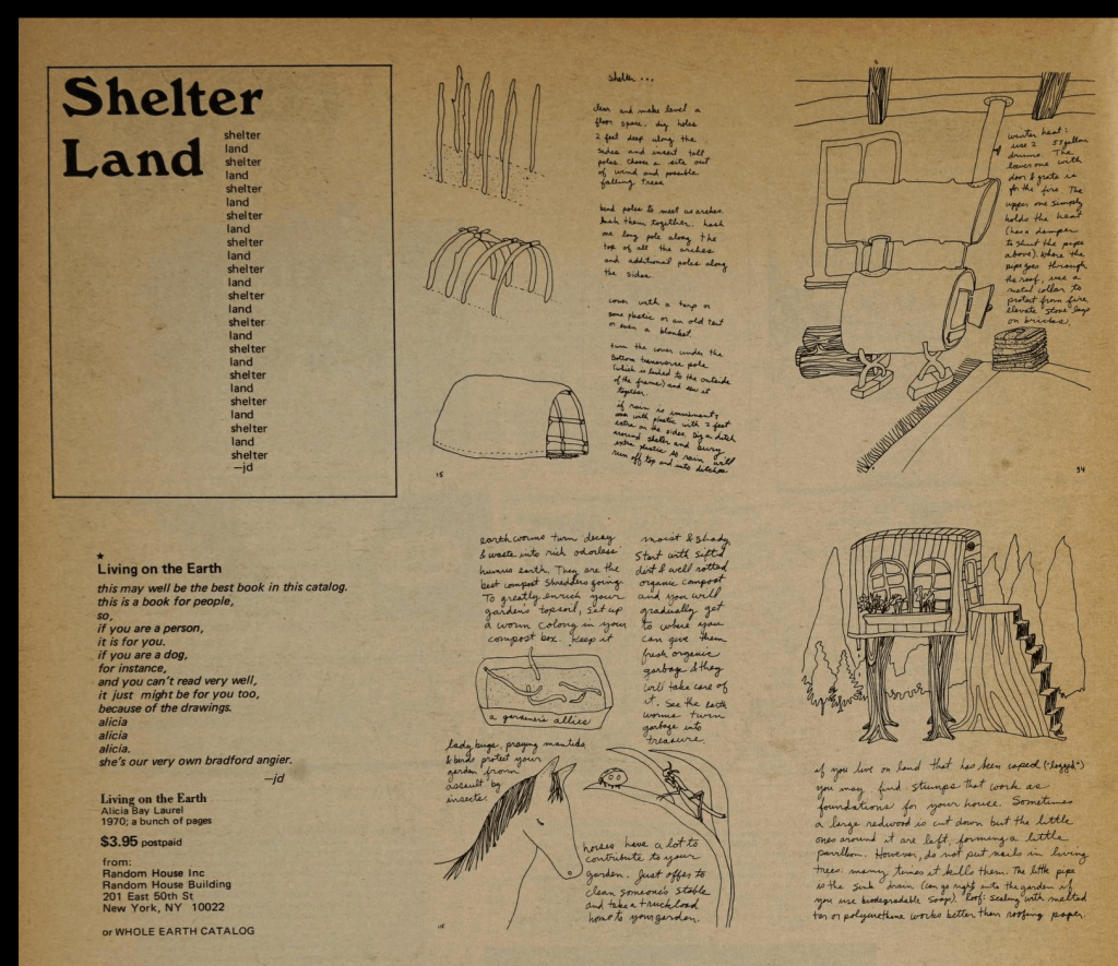 When I found the Whole Earth Catalog, I was living on my mom’s back porch. About 18. I skimmed through it, looked at everything. Sent letters to everyone that would send out brochures or samples etc. I got back loads of inspiration, including your book. It changed my life. It was a road map to freedom and community. I never looked back.