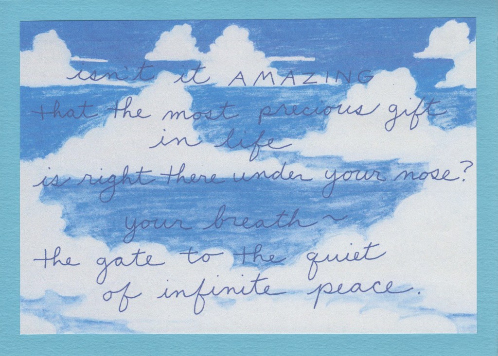 I am offering boxes of ten “The Gift of the Breath” cards with envelopes (an illustrated page from my book, How to Make Peace) for $25 each. I currently have eleven boxes of ten cards and ten envelopes in my little home warehouse.