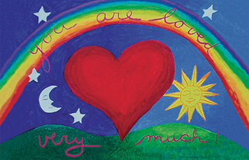 The “You Are Loved” card is a reproduction of a painting I made as a gift to my father when he was in his nineties. It’s got those deep, vibrant, holiday colors, and the message I feel most moved to share with the people I adore. I’ve got five boxes of ten cards and ten envelopes in stock.